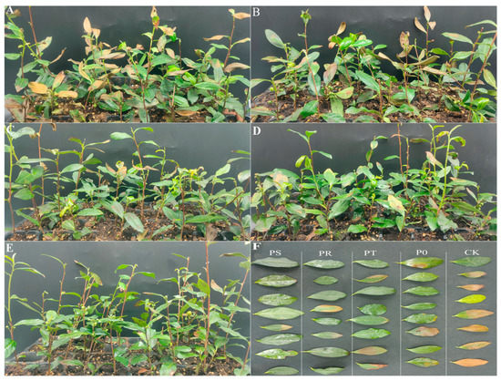 (A) Tea plant status treated with CK (spraying clean water on the leaf surface) after 6 days of high-temperature stress. (B) Tea plant status treated with P0 (spraying small peptides on the leaves) after 6 days of high-temperature stress. (C) The tea plant state of PT (spraying small peptides and tween-20 on the leaves) treatment after 6 days of high-temperature stress. (D) Tea plant status treated with PR (spraying small peptides and rhamnolipid on the leaves) after 6 days of high-temperature stress. (E) Tea plant status under PS (spraying small peptides and sophorolipid on the leaves) treatment after 6 days of high-temperature stress. (F) Leaf status of the second leaf of tea plants in each treatment group after 6 days of high-temperature stress.