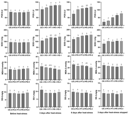 Peroxidase (POD) activity, superoxide dismutase (SOD) activity, malondialdehyde (MDA) content, and soluble sugar (SS) content of each treatment (CK, P0, PT, PR, and PS) before high-temperature stress, 3 days after high-temperature stress, 6 days after high-temperature stress, and 3 days after temperature recovery. Different letters indicate the significant difference between the control plant group and each treatment group under the given high-temperature stress time (p < 0.05). “0” represents before high-temperature stress; “1” represents 3 days after high-temperature stress; “2” represents 6 days after high-temperature stress; “3” represents 3 days after temperature recovery.
