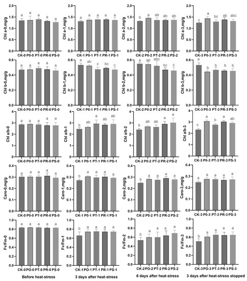 Chlorophyll a (Chl a) content, chlorophyll b (Chl b) content, chlorophyll a/chlorophyll b (Chl a/b) ratio, carotenoid (Caro) content, and Fv/Fm value among treatments (CK, P0, PT, PR, and PS) before high-temperature stress, 3 days after high-temperature stress, 6 days after high-temperature stress, and 3 days after temperature recovery. Different letters indicate the significant difference between the control plant group and each treatment group under the given high-temperature stress time (p < 0.05). “0” represents before high-temperature stress; “1” represents 3 days after high-temperature stress; “2” represents 6 days after high-temperature stress; “3” represents 3 days after temperature recovery.