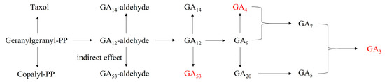 - Hedden, P.; Thomas, S.G. Gibberellin Biosynthesis and Its Regulation. Biochem. J. 2012, 444, 11–25. [Google Scholar] [CrossRef]