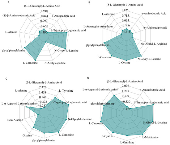 (A) The significant difference of amino acid expression between P0 and CK. (B) Differential amino acid expression between PT and CK. (C) Differential amino acid expression between PR and CK. (D) The radar chart of differential amino acid expression between PS and CK only shows the top 10 amino acids with the largest difference. The grid line corresponds to the value of the differential multiple, and the green shadow is composed of the line of the differential multiple corresponding to each substance.