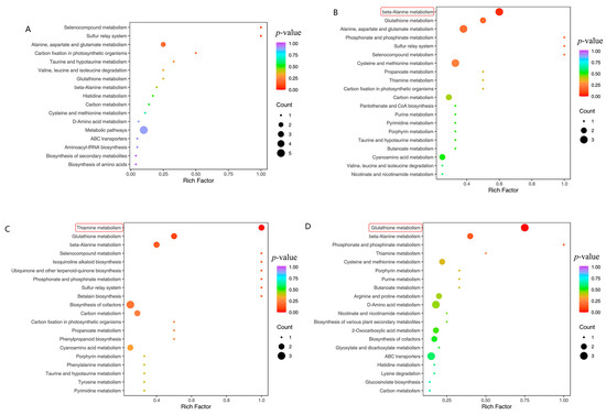 Following our initial analysis, we conducted KEGG enrichment analysis on the amino acids to gain further insight into the underlying metabolic pathways, as shown in Figure 6. Our findings revealed that the differential metabolic pathways between PT and CK were significantly enriched in Beta-Alanine metabolism (ko00410, p < 0.05, Figure 7A). Moreover, our observations indicated that the differential metabolic pathways between PR and CK were mainly enriched in Thiamine metabolism (ko00730, p < 0.05, Figure 7B). Lastly, we found that the differential metabolic pathways between PS and CK were mainly enriched in Glutathione metabolism (ko00480, p < 0.05, Figure 7C).
