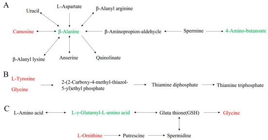 (A) Beta-Alanine metabolism, (B) Thiamine metabolism, and (C) Glutathione metabolism, Red represents a compound with a significant increase in content. Green represents a compound with a significantly reduced content.