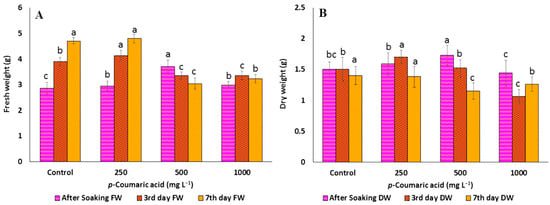 (A) Fresh weight and (B) dry weight of C. arietinum sprouts of the control and different concentrations of p-coumaric acid. Data represented mean ± SD calculated from at least three replicates of each sample; means with different letters are significantly different at p ≤ 0.05 according to Duncan’s multiple range tests (DMRT).