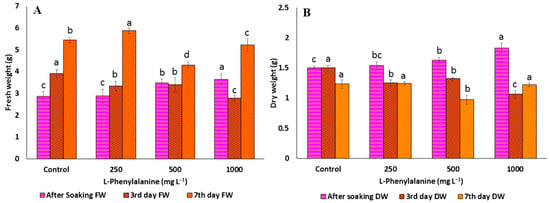 (A) Fresh weight and (B) dry weight of C. arietinum sprouts of the control and different concentrations of L-phenylalanine. Data represented mean ± SD calculated from at least three replicates of each sample; means with different letters are significantly different at p ≤ 0.05 according to Duncan’s multiple range tests (DMRT).