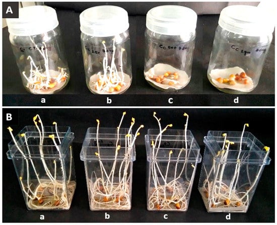 Cicer arietinum sprout at the 7th day. (A) p-coumaric acid, (B) L-phenylalanine, (a) control, (b) 250 mg L−1, (c) 500 mg L−1, (d) 1000 mg L−1, respectively.