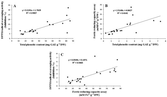 Correlation curve between (A) antioxidant activity of TPC and DPPH method, (B) antioxidant activity of TPC and FRAP assay method, and (C) FRAP and DPPH assay.