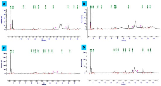 HPLC chromatogram showing the manifestation of isoflavonoid contents in C. arietinum sprout. (A) third-day control, (B) third-day treated with p-coumaric acid (250 mg L−1), (C) seventh-day control, (D) seventh-day treated with L-phenylalanine (250 mg L−1).