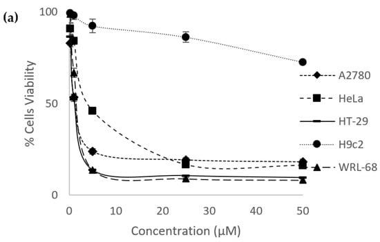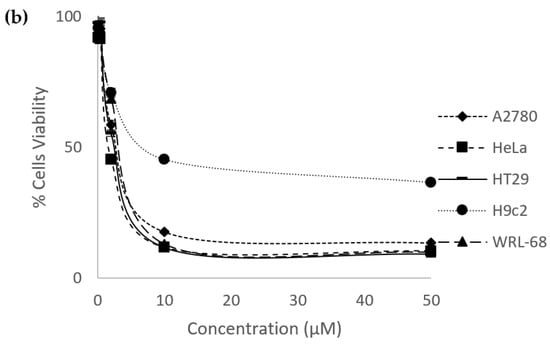 Dose–response curves of percentage of cells viability versus concentrations of (a) eurycomanone and (b) eurycomalactone when tested against ovarian (A2780), cervical (HeLa) and colorectal cancer (HT29) cancer cell lines and cardiomyocyte (H9C2) and liver (WRL-68) normal cell lines.