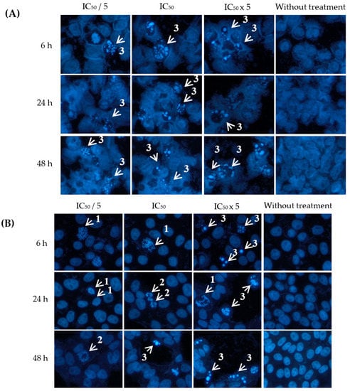 A2780, HT-29 and HeLa cancer cell lines were chosen for evaluating the apoptotic effects of eurycomanone and eurycomalactone. The morphological changes of cells undergoing apoptosis were visualised under a fluoresecence microscope after performing the Hoechst 33342 assay. Briefly, 10 × 104 cells were seeded for 500 µL/well of four Labtek® Chamber Slides (Thermo Fisher Scientific, Waltham, MA, USA) and incubated in 5% carbon dioxide in air for 24 h for the cells’ attachment. The cells were treated with concentrations of IC50/5, IC50 and IC50 × 5 values of eurycomanone and eurycomalactone in different wells and further incubated for 6, 24 and 48 h, respectively. Nontreated cells were also included in the experimental design, which acted as a negative control in this study. Following this, the media from each well were discarded and cells were fixed with 4% (w/v) paraformaldehyde for 30 min. The cells were then washed with cold phosphate buffer solution (PBS) prior to staining using Hoechst 33342, according to the method of [26]. Quantitative assessment of apoptotic cells were determined by counting apoptotic nuclei from five randomly chosen areas corroborating visual impression based on the morphology shown in Figure 3 and Figure 4. The apoptotic index (number of apoptotic nuclei per total nuclei × 100) was expressed as a percentage of the mean ± S.E.M and analysed using ANOVA followed by Tukey’s multiple comparison test.