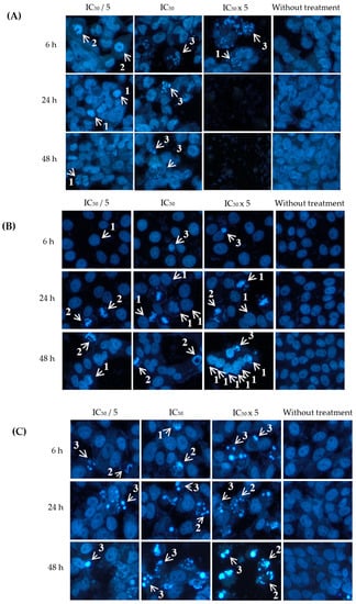 Visualization of (A) ovarian (A2780), (B) colorectal (HT29) and (C) cervical (HeLa) cancer cells when treated with eurycomanone at different concentrations (IC50/5, IC50, IC50x 5) and incubation times (6, 24 and 48 h) with Hoechst 33342 staining. Arrows indicate different stages of apoptosis: (1) extensive chromatin condensation, (2) highly compact chromatin at the periphery of the nucleus and (3) apoptotic bodies. Magnification: ×200.