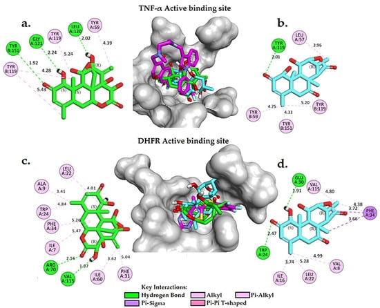 A 3D and 2D interaction analysis of docked models of eurycomanone (a) and eurycomalactone (b) with the TNF-α active binding site, and eurycomanone (c) and eurycomalactone (d) with the DHFR active binding site, was conducted using BIOVIA Discovery Studio Visualizer. The original crystal structure is depicted in pink for carbon (C), red for oxygen (O), cyan for fluorine (F), orange for sulphur (S) and blue for nitrogen (N). Eurycomanone is shown in green for C and red for O, and eurycomalactone is depicted in cyan for C and red for O.