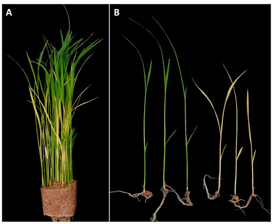 Many genes associated with chlorophyll biosynthesis have been identified using leaf color mutants derived from genetic populations or mutagenesis, and various leaf color phenotypes have been observed [14]. Most rice leaf color mutants are associated with chlorophyll metabolism [6]. One of the most common is the albino mutant, which lacks all leaf pigments (chlorophylls, carotenoids, and anthocyanins). Others that have been reported include chlorosis, thermo-color, light green, green-revertible albino, purple, white-striped, stay-green, yellow, and lethal yellow leaves [6,15,16,17,18]. A number chlorophyll-deficient yellow leaf mutants have been reported in Arabidopsis, barley, and rice, and most have mutations affecting Mg-chelatase and production of Mg-Proto IX [15,17,19].