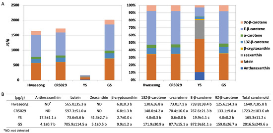 HPLC analysis of carotenoid content. Carotenoid content shown with (A) bar graph and (B) table. Data are represented by the mean ± standard deviation (n = 3). Letters indicate a significant difference at p < 0.05 based on Tukey’s test.