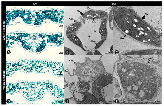 Anatomical analysis using light microscopy showed that the internal leaf structure differed significantly between the GS and YS. The mesophyll of the GS was compact, and the stained parenchyma was composed of numerous cells throughout the leaves (Figure 3A). However, the mesophyll of the YS was more loosely organized, and the stained parenchyma was sparse (Figure 3D). Ultrastructural analysis showed that the structure of chloroplasts from GS significantly differed from YS. The chloroplasts of GS leaves were normal in shape and contained thylakoid membranes with dense and well-structured grana stacks, starch granules, and osmiophilic plastoglobuli (Figure 3B,C). In contrast, the chloroplasts in YS leaves did not display the usual structure and had no observable grana lamella stacks (Figure 3E,F).