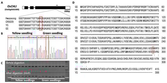 Sequence analysis of OsCHLI. (A) Gene structure and sequence comparison of Hwaseong, CR5029, yellow seedling (YS), and green seedling (GS). * indicates stop codon location. (B) Sanger sequencing confirmation of 2-bp AG deletion. (C) Genotyping of yellow and green seedlings with ELL_dCAPs marker. Green seedlings heterozygous at the locus show both bands after HinfI restriction digest. Full-length gel is presented in Supplementary Figure S5. (D) Alignment of predicted protein sequence from GS and YS alleles. Red box indicates corresponding position of the 2-bp nucleotide deletion.
