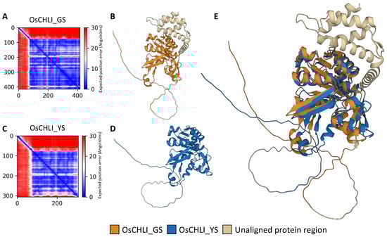 To examine the effect of the 2-bp deletion on the OsCHLI protein, ColabFold was employed to predict and compare the structures OsCHLI from GS (OsCHLI_GS) and YS (OsCHLI_YS). Prediction results revealed that the alignment error of the N-terminus region of OsCHLI_GS and OsCHLI_YS was very high, indicating that the prediction accuracy of this region was low (Figure 6A,C). However, the other amino acid sequences of OsCHLI_GS and OsCHLI_YS were predicted with high accuracy, and the 3-dimensional protein structures of OsCHLI_GS and OsCHLI_YS were successfully predicted (Figure 6B,D). Two predicted structures were aligned with pairwise protein alignment, and the two structures overlapped with high similarity (Figure 6E). The unaligned protein is shown in beige and corresponds to the truncated region of OsCHLI_YS (Figure 6E).
