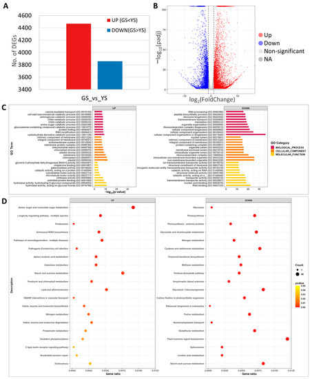 RNA-seq analysis was carried out using leaf samples from 10-day-old YS and GS seedlings. A total of 8327 DEGs were identified between the YS and GS. Among the 8327 DEGs, 4468 and 3859 genes were up-regulated and down-regulated, respectively (Figure 7A, Supplementary Tables S1 and S2). The volcano plot showed distribution of a statistical significance and altered expression level of the DEGs between YS and GS (Figure 7B).