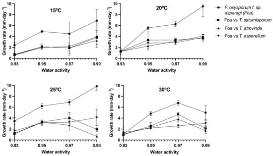 Surface contour plot of daily growth rate responses at varying temperatures and water activities. Fusarium oxysporum f. sp. asparagi (Foa): (up–left); Foa vs. T. saturnisporum: (up–right); Foa vs. T. asperellum: (down–left); Foa vs. T. atroviride: (down–right).