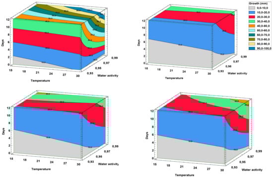 Analysis of variance was performed using Fisher’s least significant difference (LSD) test with STATGRAPHICS Centurion XVIII statistical package software (StatPoint, Inc., Herndon, VA, USA, https://www.statgraphics.com/centurion-xviii, accessed on 1 May 2023). Graphics were analyzed using GraphPad Prism (version 9.0 for Windows, GraphPad Software, San Diego, CA, USA, www.graphpad.com, accessed on 1 May 2023). To estimate the correlation between the growth rate at any of the studied temperatures and the water activity, we adjusted a simple regression analysis to the non-linear inverse-X model, as it showed the highest R2 value. The same statistical package software was used to construct a generalized linear model of the growth rate (Yi = β0 + β1 × 1, i + β2 × 2, i + β3 × 3, i + … + βk × k, i + εi, where “Y” is the response variable (growth rate), “β1Xk,i” the predictor variables (temperature and water availability), and “i” the error). The linear regression of the increase in radius against time (d) was used to obtain growth rates (mm·d−1). The Pearson correlation coefficient at the 5% confidence level was used as the significance criterion.
