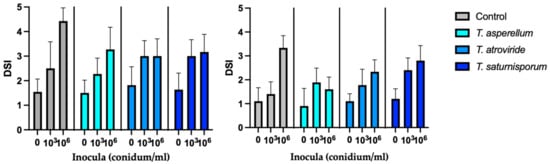 We analyzed the impact of inoculum quantity in the substrate on disease symptom manifestation during early development stages at two different temperatures. We observed a direct correlation between the amount of inoculum and DSI, with high exponential correlations at both temperatures (y = 0.569·e0.5543x, R-Squared = 0.941 at 25 °C; y = 0.828·e0.5413x, R-Squared = 0.980 at 30 °C). Application of Trichoderma did not result in any statistically significant differences (p < 0.001) compared to the untreated control or lower inoculum density. Nonetheless, a notable reduction in the severity index was evident in treatments with high inoculum density (106 conidium·mL−1) for all three species of Trichoderma tested at both temperatures (Figure 3).