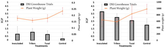 Dry weight and Disease Severity Index (DSI) in pretreated asparagus plants after inoculation with FOA in Greenhouse trials (Left) and Semi-field trials (Right).