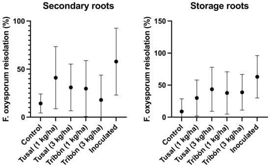 Irrespective of dosage, the test results consistently showed that the pathogen affected a higher percentage of secondary roots compared to reserve roots. However, using a higher dose (3 kg·ha−1) decreased this effect, though the disease was never fully suppressed and the recorded DSI remained above two. However, inoculation treatment consistently resulted in a higher percentage of isolation for both types of rot (Figure 5).