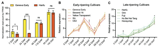 The expression patterns of MD06G1142700 are consistent with fruit development in apples. (A) Expression levels of MdKING1 during fruit development at different periods in apple cultivars “Geneva Early” and “Hanfu”. (B) MD06G1142700 expression levels in early-ripening cultivars. (C) MD06G1142700 expression levels in late-ripening cultivars. Fragments per kilobase per million mapped fragments (FPKM) of MD06G1142700 in different fruit development stages and different tissues were retrieved from the previous data. Error bars indicate SD (n = 3). Statistical significance analysis was determined using Student’s two-tailed t test (* p ≤ 0.05, ** p ≤ 0.01, *** p ≤ 0.001; ns, no significance).