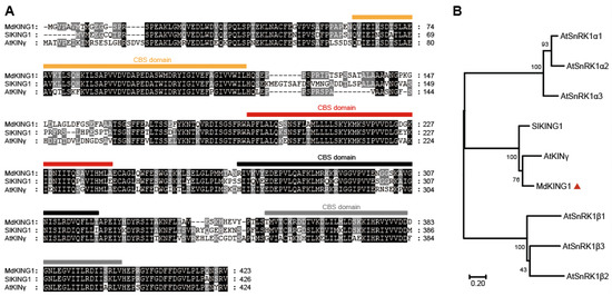 MdKING1 (MD06G1142700) is the homologous of SnRK1 γ subunit in apple. (A) Sequence alignment of KING1 (KINγ) proteins in apple, tomato, and Arabidopsis; the predicted CBS domains are indicated by squares. (B) Phylogenetic analysis of KING1 (KINγ) proteins, SlKING protein, and other SnRK1 subunits in Arabidopsis. The numbers at the nodes of the branches represent bootstrap values. Md, Malus domestica; Sl, Solanum lycopersicum L.; At, Arabidopsis thaliana. Accession numbers are as follows: MdKING1 (MD06G1142700), SlKING1 (Solyc03g111310.3.1), AtSnRKα1 (At3g01090), AtSnRKα2 (At3g29160), AtSnRKα3 (At5g394400), AtSnRKβ1 (At5g21170), AtSnRKβ2 (At4g16360), AtSnRKβ3 (At2g28060), and AtKINγ (AT3G48530). The orange, red, black, and gray bars represent the 4 CBS domains. The red triangle remarks the protein of MdKING1.