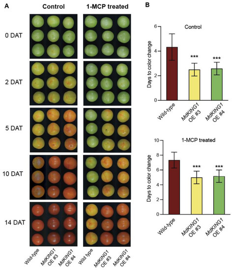 Overexpressing MdKING1 in tomatoes reduced the fruits sensitivity to 1-MCP treatment. (A) Morphology of wild-type and MdKING1 OE tomato fruits at 0, 2, 5, 10, and 14 days after control and 1-MCP treatment, respectively. DAT represents days after treatment. (B) Days from treatment beginning to color change stage in wild-type and MdKING1 OE fruits under control conditions and 1-MCP treatment conditions, respectively. Air treatment was used as a control. Error bars indicate SD (n = 10). Asterisks indicate the significant differences between the MdKING1 OE fruits and the wild-type in each group (*** p ≤ 0.001).