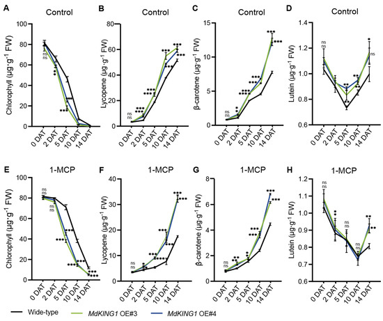 Several important indexes of fruit ripening in wild-type and MdKING1 OE fruits. (A–D) Chlorophyll, lycopene, β-carotenoids, and lutein content at different days after treatment under control conditions, respectively. (E–H) Chlorophyll, lycopene, β-carotenoids, and lutein content at different days after 1-MCP treatment, respectively. Error bars indicate SD (n = 3). Asterisks indicate the significant differences between the MdKING1 OE fruits and the wild-type in each group (* p ≤ 0.05, ** p ≤ 0.01, *** p ≤ 0.001; ns, no significance).