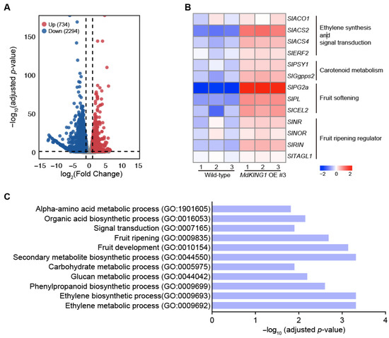 Transcriptome profiling analysis of wild-type and MdKING1 OE fruits at Br stage. (A) Volcano map of differentially expressed genes (DEGs, log2 (fold change) ≥ 1) between wild-type and MdKING1 OE fruits. Up and down refer to the upregulated and downregulated DEGs, respectively. (B) Heatmap analysis of the fruit ripening-related DEGs between wild-type and MdKING1 OE fruits. (C) GO enrichment analysis of DEGs between wild-type and MdKING1 OE fruits.