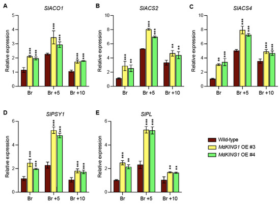 We also investigated whether the ripening-related genes were modulated in MdKING1 OE lines compared to WT. The heatmap of Figure 6B showed genes involved in ethylene synthesis and signal transduction (SlACO1, SlACS2, SlACS4, and SlERF2) [11,38], carotenoid metabolism (SlPSY1 and SlGgpps2) [39,40], fruit softening (SlPG2a, SlPL, and SlCEL2) [41,42], and the key fruit ripening regulator (SlNR, SlNOR, SlRIN, and SlTAGL1) [43,44]; the expression level of all these genes was significantly increased in the MdKING1 OE lines compared to that of WT. In addition, we verified the expression levels of SlPL, SlPSY1, SlACO1, SlACS2, and SlACS4, which were the DEGs in WT and MdKING1 OE lines at the Br stage (Figure 7), the transcript levels of these five genes were significantly higher in MdKING1 OE lines than WT, consistent with RNA-seq data. Finally, we also detected the expression levels of these five genes at other development stages to determine the role of MdKING1 in promoting fruit ripening. As expected, the expression of all these genes in MdKING1 OE lines was also higher than WT at Br +5 and +10 stages, and these genes were more highly expressed at the Br +5 stage than the other stages (Figure 7). In summary, these results suggest that MdKING1 could affect the expression of genes related to fruit firmness as well as carotenoid and ethylene synthesis, thereby affecting fruit ripening.
