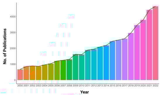Publications per year based on Scopus data from 2000 to 2022, quantifying “phosphorus” studies in “plants”.
