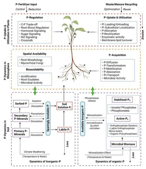 A diagrammatic representation of phosphorus dynamics from soil to plants. Adapted from [25] with modifications. Created using BioRender (accessed on 23 March 2023, https://biorender.com/).