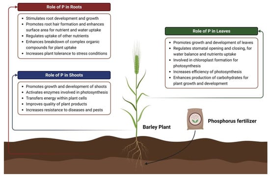 Localized functions of phosphorus in different parts of the plant. Created using BioRender (accessed on 4 May 2023, https://biorender.com/).
