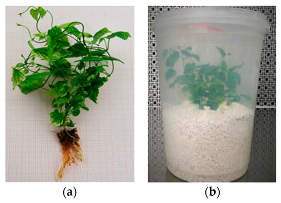 - Machado, M.P.; Gomes, E.N.; Francisco, F.; Bernert, A.F.; Bespalhok Filho, J.C.; Deschamps, C. Micropropagation and establishment of Humulus lupulus L. plantlets under field conditions at southern Brazil. J. Agric. Sci. 2018, 10, 275. [Google Scholar] [CrossRef][Green Version]