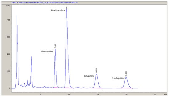High-performance liquid chromatography (HPLC) was used to determine α- and β-acids and xanthohumol in the hop according to the Analytica-EBC 7.7 method [54]. The separation was achieved on a Nucleodur 5–100 C18, 125 × 4 mm HPLC analysis column (Macherey-Nagel, Düren, Germany) while a 10 µL injection loop on an HPLC injector was used. The isocratic mobile phase constituted distilled water, methanol (Sigma-Aldrich, Taufkirchen, Germany), and 85% aqueous solution of ortophosphoric acid (Sigma-Aldrich, Germany) in a ratio of 775/210/9 (v/v/v). The detection was carried out with a diode array detector (DAD) set at 314 nm for α- and β-acids (Figure 1) and 370 nm for xanthohumol (Figure 2). The quantification was performed according to the external standard ICE4 (Labor Veritas, Zürich, Switzerland). All solvents were of analytical grade purity.