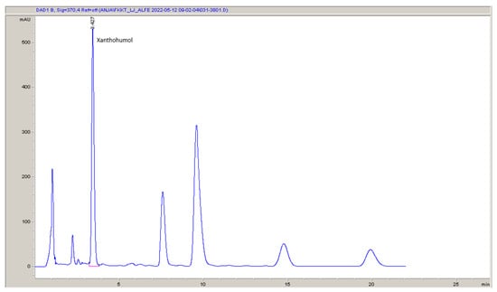 An example (sample 34—see Section 2.11) of the HPLC-DAD chromatogram used for the determination of xanthohumol. The wavelength was 370 nm.