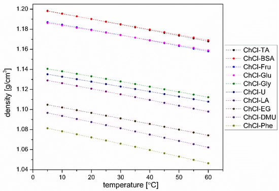 The measured densities show (Figure 6) that—as expected—the densities of all prepared concentrated aqueous solutions decrease with the increase of temperature. As it can be seen, this decrease is fairly regular and, to a first approximation, linear with very similar slopes. The highest densities are those of ChCl-TA and ChCl-BSA, followed by ChCl-Fru and ChCl-Glu. For the latter, one would expect identical or nearly identical densities at given temperatures, and this expectation is met here. It is difficult to say whether the minimal differences between them are due to the small differences in the structure of the two monosaccharides or whether it is an experimental error (small differences in the composition of the prepared solvent). Although both solvents were prepared with the usual care, we did not check the content of water in these monosaccharides, so we cannot exclude the possibility that the observed minimal differences are at least partly due to a slightly different composition of the two solvents.