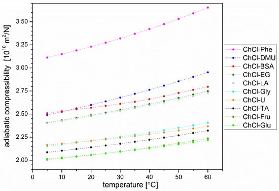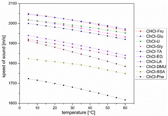 The speed of sound propagation in liquids is equal to the square root of the ratio between the bulk modulus (which is the reciprocal of adiabatic compressibility) and the density of the liquid. Considering that the bulk modulus also depends on the distances between the particles in the liquids and that these distances are related to the density, it is not trivial to predict the speed of sound in liquids with quite similar compositions. Therefore, only the experimentally measured temperature dependence of the sound velocity in the prepared DESs is shown in Figure 7. These values are then used for the adiabatic compressibility calculations shown in Figure 8.