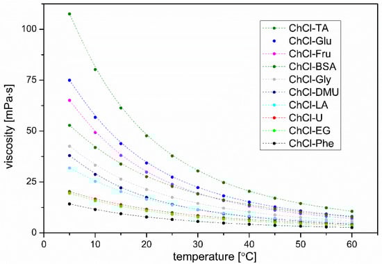 Dynamic viscosities (h, mPa·s) were measured in the same temperature range as density and speed of sound (from 5 °C to 60 °C) using an Anton Paar Lovis 2000 M/ME rolling-ball viscometer. In order to obtain the optimal run times of the measurements, for these measurements the capillary with a diameter of 1.8 mm was chosen. Steel balls were used for most measurements, except for the measurement of the viscosity of the ChCl-LA, ChCl-TA, and ChCl-BSA sample, where gold-plated balls were used to avoid corrosion of the balls. Before use, the measuring system was calibrated with the viscosity standard.