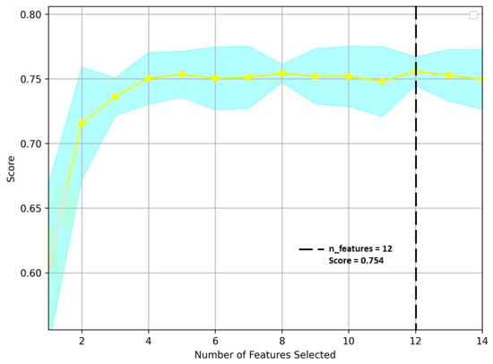Twelve texture features were selected using the random forest recursive feature elimination (RF-RFE) method with two others (Entropy and Information measures of correlation I) eliminated from all the features. The result shows that the 12 features were essential to obtain the highest score by performing the RFE algorithm with cross-validation. Figure 1 shows that the RFE uses a random forest algorithm to test the combination of features, where the number of features was 12 with a maximum score of 0.754. Yellow line in the Figure 1 indicates the feature scores obtained during the RF-RFE process. The highest point on the yellow line indicates the maximum score achieved during the RF-RFE process. This point corresponds to the set of features that leads to the best performance for predicting soybean lodging. These twelve features, one target, and 1266 observations (plots) were used to analyze the soybean lodging using four machine learning classifiers.
