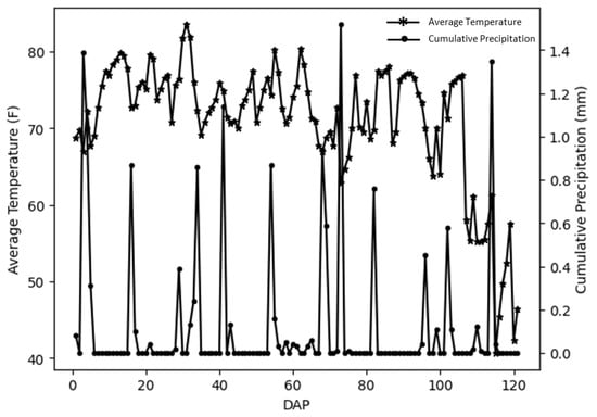 The field experiment was conducted in 2019 at the Bay Farm Research Facility (38°54′08.3″ N, 92°12′29.8″ W), Columbia, Missouri, United States. The field is in a humid subtropical region (Köppen climate classification code: Cfa) [53]. The experimental field was a preliminary yield trial (PYT) to select advanced yield trial (AYT) genotypes. The breeding lines were observed for several traits throughout the growing and harvesting period. One thousand and seven hundred seventy-three (1773) soybean genotypes were planted in four-row plots with a row length of 3.6 m and row spacing of 0.8 m on 3 June 2019 (without replicates). The distance between each plot was the same as the row spacing, and the end-to-end spacing between the two plots was 0.6 m. Weather conditions during the growing season showed in Figure 5, which includes daily average temperature and cumulative precipitation. The weather data was acquired from the nearby weather station (Bradford Research and Extension Center), a part of Missouri Mesonet—Weather Station Network, located within 1.01 (km) of the studied field plots.