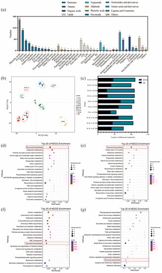 Analysis of metabolites and differential metabolites between periods in R. latoucheae. (a) a statistical chart of the metabolic classes and numbers contained in the petals of R. latoucheae. (b) PCA principal component analysis of metabolites in petals in various periods. (c) Number of differential metabolites, Screening for differential metabolites based on VIP ≥ 1 and t-test p < 0.05. (d–g) KEGG enrichment analysis of differential metabolites. From top to bottom, the enrichment analysis of the differential metabolite KEGG in S1 (d), the enrichment analysis in S2 (e), the enrichment analysis in S3 (f), and the enrichment analysis in S4 (g).