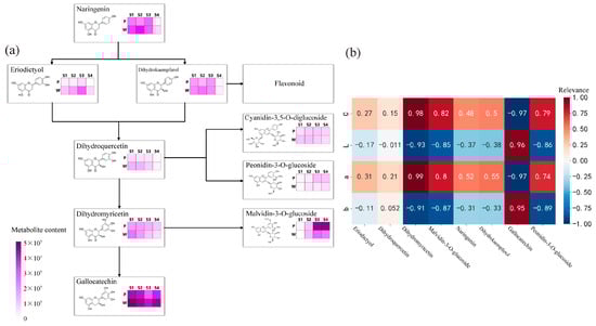 The results of the analysis of the anthocyanin synthesis mode are presented in Figure 3a. During flowering, the contents of metabolites such as naringenin, eriodictyol, dihydrokaempferol, dihydroquercetin, dihydromyricetin, peonidin-3-O-glucoside, malvidin-3-O-glucoside, and gallocatechin exhibited differences, with the most significant differences observed in the content of malvidin-3-O-glucoside and gallocatechin in the dihydromyricetin branch. The anthocyanin that exhibited the most significant difference in purple plants during the S3 and S4 periods was malvidin-3-O-glucoside. Finally, the correlation analysis (Figure 3b) between the content of differential metabolites and flower color during the S3 and S4 periods revealed weak correlations between metabolites such as naringenin, eriodictyol, dihydrokaempferol, and dihydroquercetin, and flower color presentation. Dihydromyricetin, malvidin-3-O-glucoside, and peonidin-3-O-glucoside showed significant positive correlations with the C and a values of antler Rhododendron color. Gallocatechin exhibited a negative correlation with the C and a values of flower color. Therefore, dihydromyricetin, malvidin-3-O-glucoside, malvidin-3-O-galactoside, gallocatechin, and peonidin-3-O-glucoside are the key floral pigments that influence flower color during the early flowering stage and in full bloom.