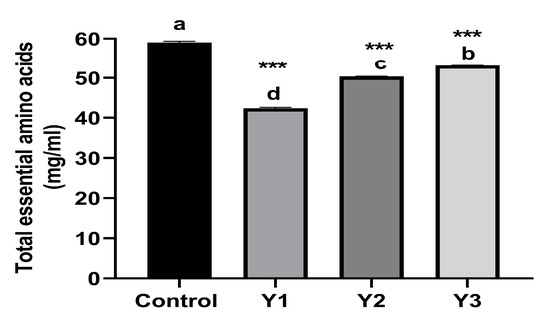Table 1 and Figure 2 illustrate the amino acid profile of N. oceanica grown in 1, 1.25, and 1.5% dilutions of yeast wastewater, as well as the control (F/2). The current investigation found that the amino acid profile did not vary between the different treatments, but the content of specific amino acids, however, varies visibly between the various treatments. The data showed a highly significant difference (p < 0.001) in the total amino acids, total essential amino acids, and total nonessential amino acids of N. oceanica between the different treatments. The results recorded that N. oceanica had the greatest concentrations of total essential amino acids EAA (59.07 ± 0.29 mg/mL), total nonessential amino acids NEAA (52.80 ± 0.26 mg/mL), and total AA (111.87 ± 0.32 mg/mL) at the control (F/2) medium. However, at Y1 (1%) yeast wastewater dilution, the lowest concentrations of total AA, total EAA, and total NEAA were determined. Leucine, lysine, and arginine were found to be the three most prevalent EAA in the control (F/2) medium and the three yeast wastewater dilutions. Meanwhile, the most abundant three NEAA in the control (F/2) medium were alanine, glutamate, and proline. But, glutamate, aspartate, and proline were the three most common NEAA in all three yeast wastewater dilutions.