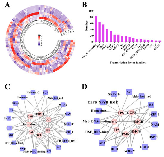 Differentially expressed transcription factors (TFs) in response to mechanical wounding in Aquilaria sinensis. (A) Heatmap of DEGs encoding for TFs. FPKM values of the individual genes were normalized across the rows and the heatmap was visualized in R. (B) Bar chart of major TF families of these TFs. (C) The co−expression network of TFs and DEGs involved in lignin biosynthesis. (D) The co−expression network of TFs and DEGs involved in sesquiterpene biosynthesis. The genes involved in secondary metabolism are represented by pink circles and transcription factors are represented by blue rectangles.