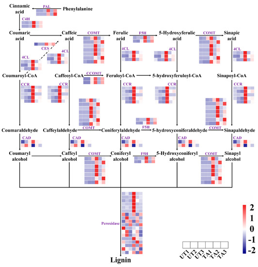 We found 44 DEGs that were involved in lignin biosynthesis, including PAL, 4CL, C4H, cinnamyl alcohol dehydrogenase (CAD), cinnamoyl-CoA reductase (CCR), caffeic acid O-methyltransferase (COMT), caffeoyl-CoA O-methyltransferase (CCoAMT) and pexoridase-encoding genes (Figure 2). Among them, a total of 30, 6 and 6 DEGs were detected in TA1 vs. UA1, TA2 vs. UA2 and TA3 vs. UA3, respectively. Moreover, PAL, 4CL, C4H, caffeoylshikimate esterase (CSE), ferulate 5-hydroxylase (F5H), CCoAMT, CCR and COMT genes, as well as several pexoridase-encoding genes were up-regulated in the TA groups as compared to their respective (untreated) controls (Figure 2), indicating their contribution towards the biosynthesis of lignin. The expression of CCoAMT, CCR, 4CL, COMT, F5H, CSE, CAD and C4H genes were highest in TA1, followed by TA3 and TA2 (Figure 2). At the same time, the expression levels of most of the genes involved in lignin biosynthesis had little differences across UA1, UA2 and UA3 (Figure 2).