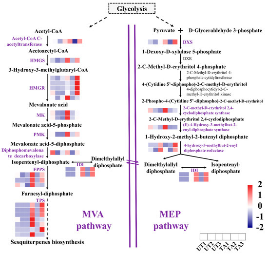 A total of 37 DEGs were significantly enriched in the terpenoid backbone biosynthesis and the sesquiterpene biosynthesis pathways (padj < 0.05). In sesquiterpene biosynthesis, a total of 10, 3 and 10 up-regulated genes were detected in TA1 vs. UA1, TA2 vs. UA2 and TA3 vs. UA3 comparisons, respectively. Among them, the expression of HMGS, HMGR and PMK was significantly increased in all the TA groups. For example, the HMGR genes were up-regulated by more than six-fold in TA3 as compared to UA3 (Figure 3). Further, the expressions of seven genes encoding for terpene synthase (TPS) were significantly increased by about 6- to 16-fold in TA groups (Figure 3). The majority of sesquiterpene biosynthesis genes were expressed at the highest levels in TA3, followed by TA1 and TA2 (TA3 > TA1 > TA2; Figure 3). At the same time, expression of the majority of these genes was not significantly different in the UA groups (Figure 3).